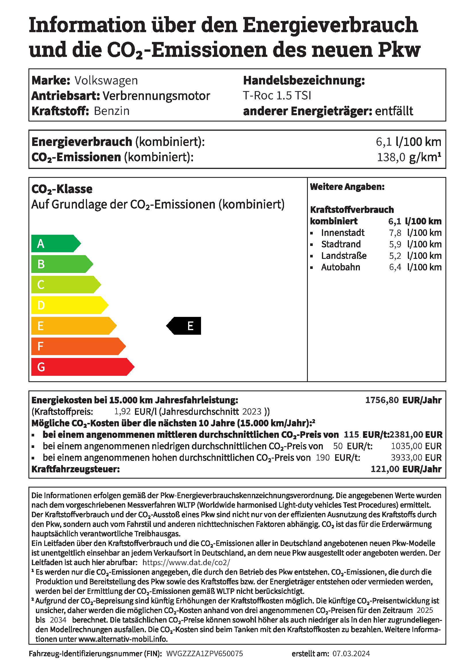 Energiekosten bei 15.000 km Jahresfahrleistung:(Kraftstoffpreis:1,92 EUR/l(Jahresdurchschnitt 2023)) 1757,00 EUR/Jahr